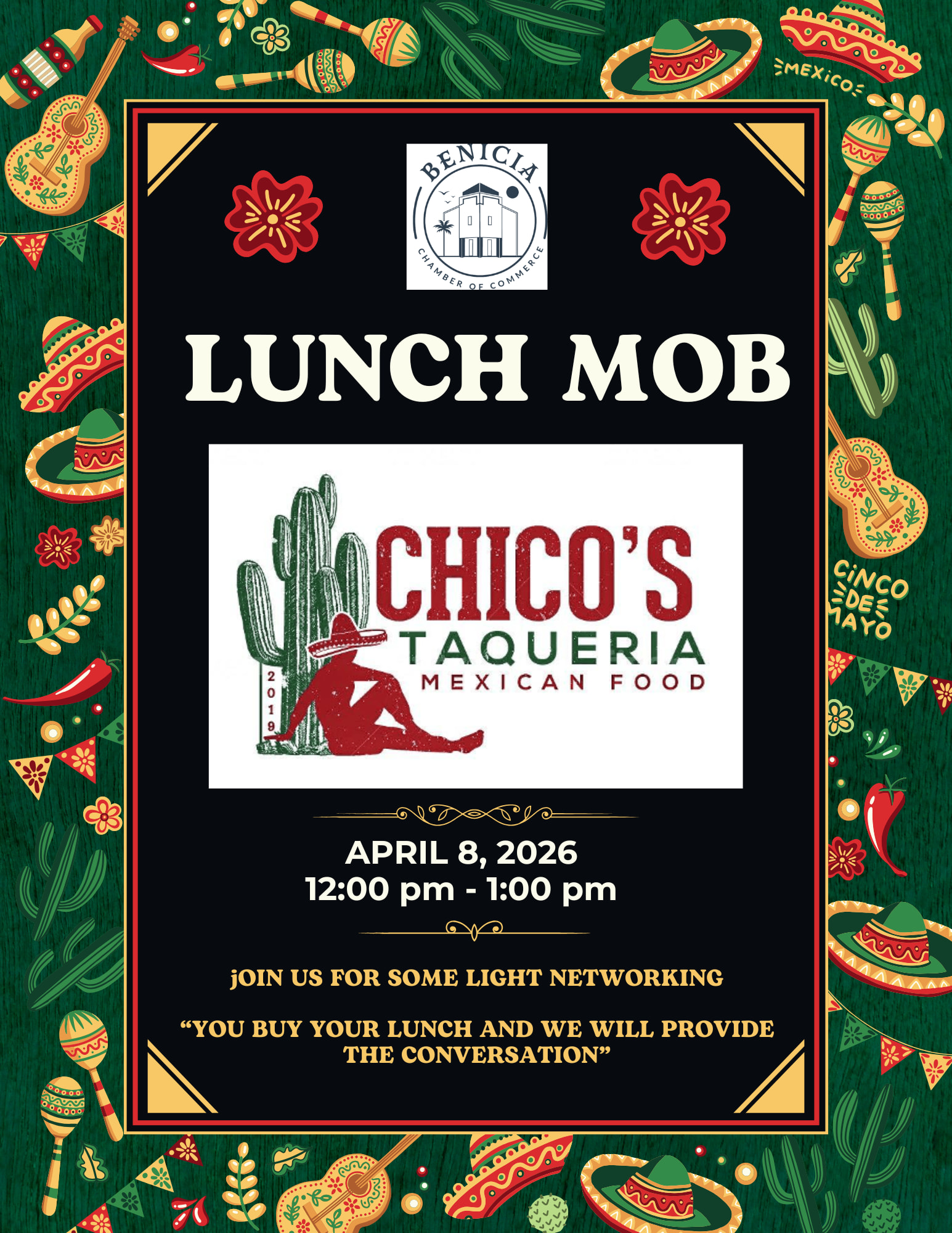 Join us for some light networking and a delicious meal! 'You Buy your lunch and we will provide the conversation' Chicos | 82 Solano Square | Benicia 12:00 - 1:00pmImages