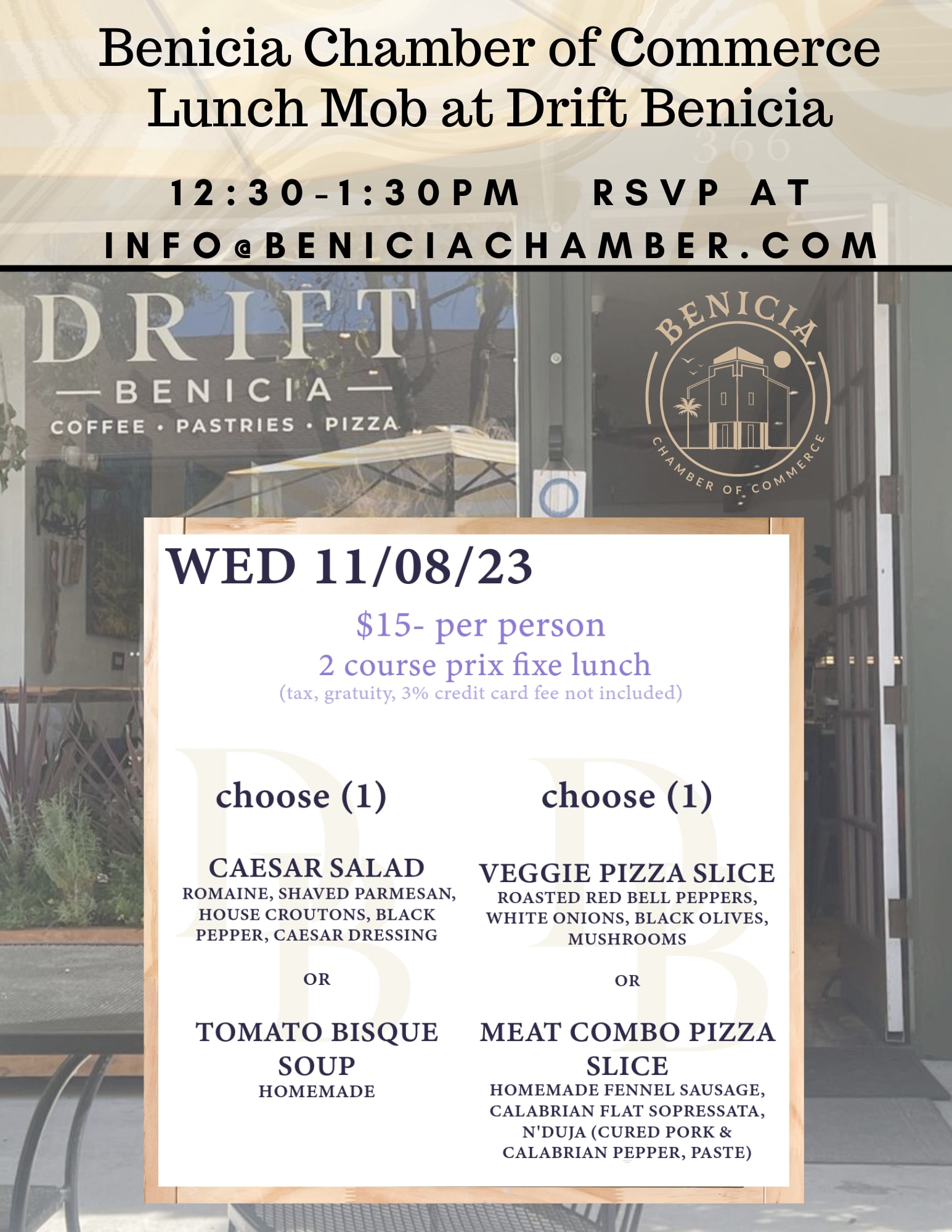 Join the Benicia Chamber of Commerce for lunch at Drift Benicia at 366 1st Street. Lunch is $15 per person. You can chose a Caesar Salad or Tomato Bisque Soup and then for the second course you have a choice of Veggie Pizza or Meat Combo. Meet new people and enjoy the delicious food that Drift has to offer.Images