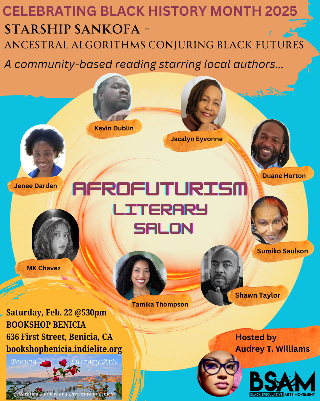 Bookshop Benicia (636 First Street in downtown Benicia) will host a stellar Black History month event. Attendees will witness the literary launch of 'Starship Sankofa: Ancestral Algorithms Conjuring Black Futures.' The event will feature nine outstanding Black speculative fiction authors who will read from their selected works, weaving tales to chart a course through time. Listen to the cultural wisdoms that prime imaginations for liberated Black futures, each story acting as a starry node in the constellation of Afrofuturism. Books will be available for sale and light refreshments will be offered. This will surely be one of the most exciting and interesting literary events of 2025!