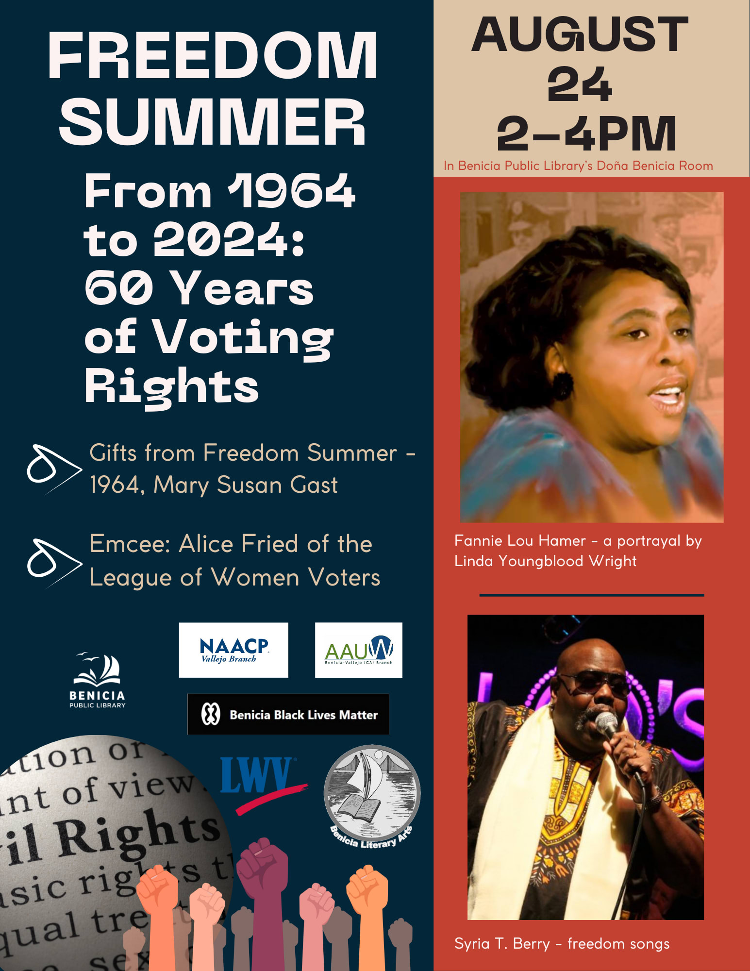 Freedom Summer: From 1964-2024 60 years of voting rights. Gifts from Freedom Summer-1964, Mary Susan Gast Emcee: Alice Fried of the League of Women Voters AUgust 24th 2-4pm In Benicia Public Library's Dona Benicia RoomImages