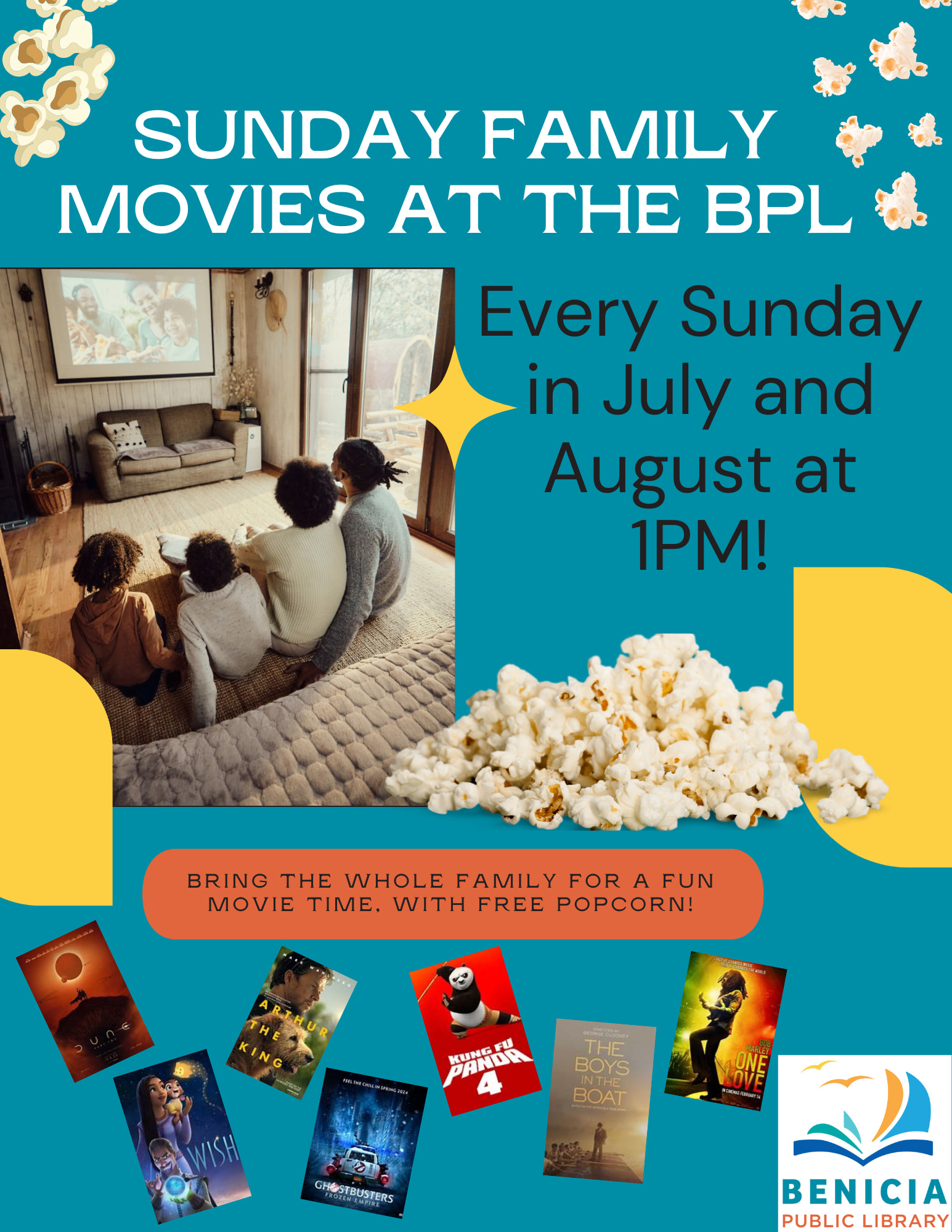 Every Sunday in August at 1pm come watch a movie with the whole family! Free popcorn provided!Images