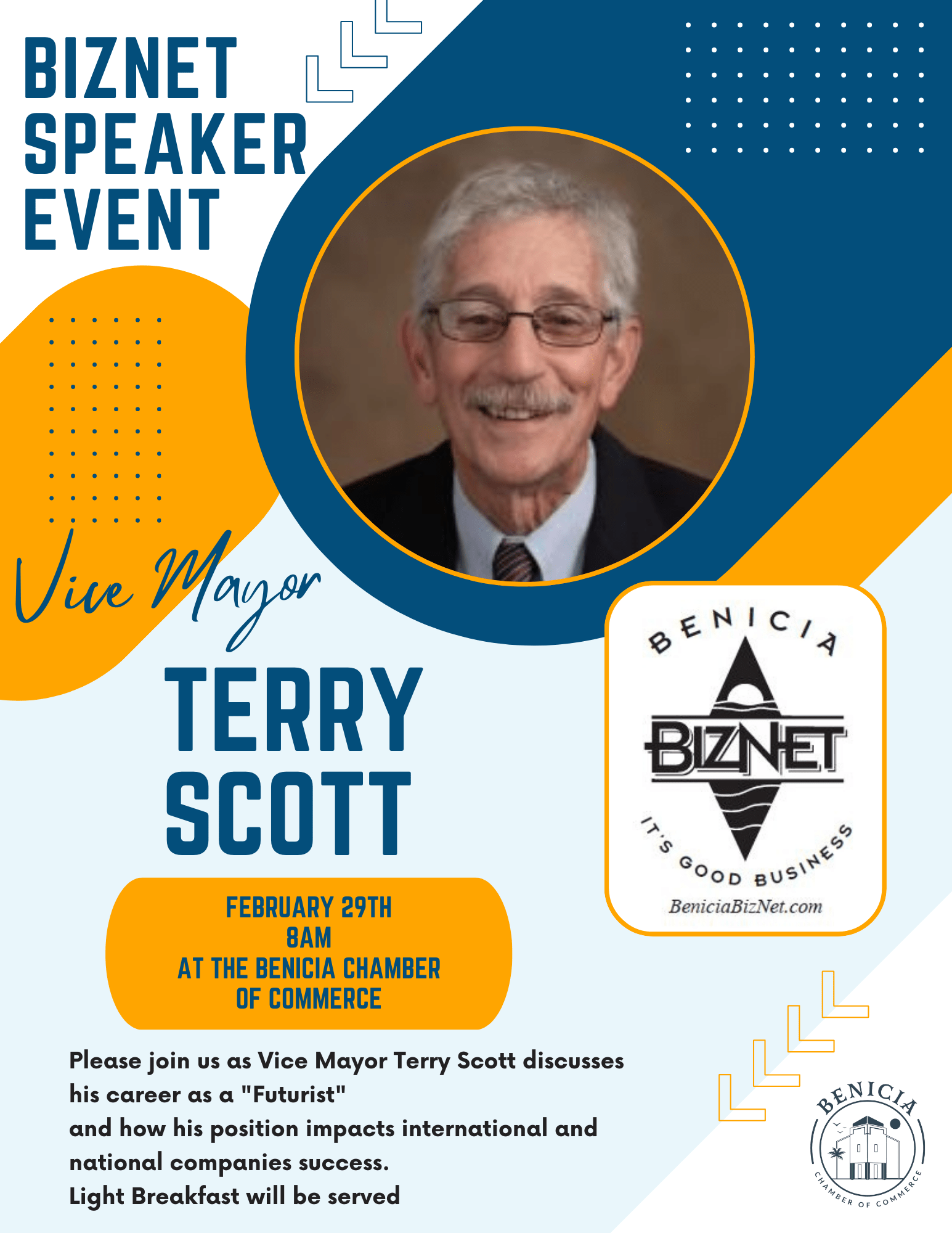 Please join us as Vice Mayor Terry Scott discusses his career as a 'Futurist' and how his position impacts international and national companies success. Light Breakfast will be served.Images