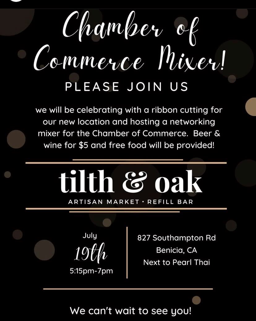 Please Join us at the Benicia Chamber of Commerce mixer hosted by Tilth & Oak artisan market and refill bar.