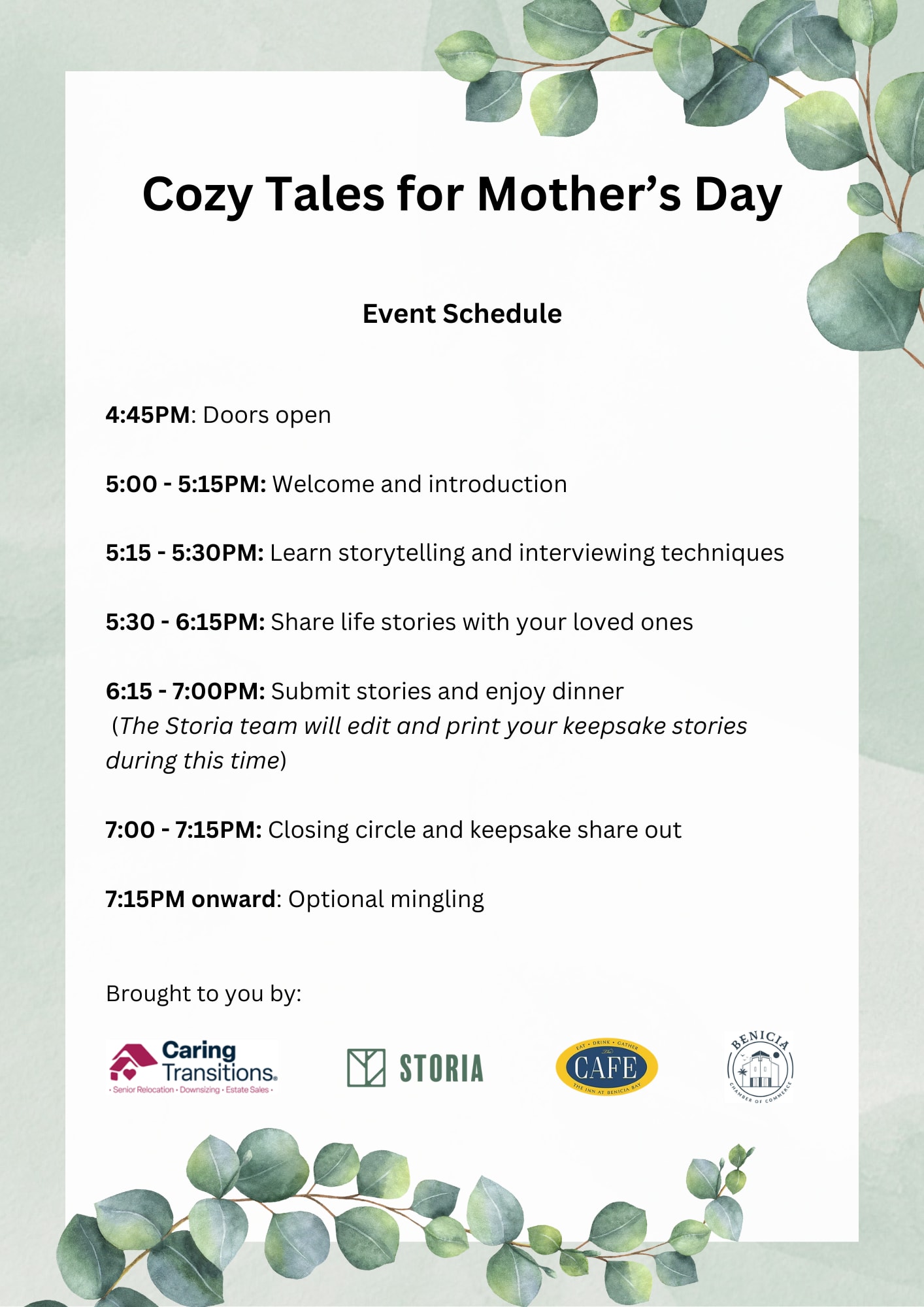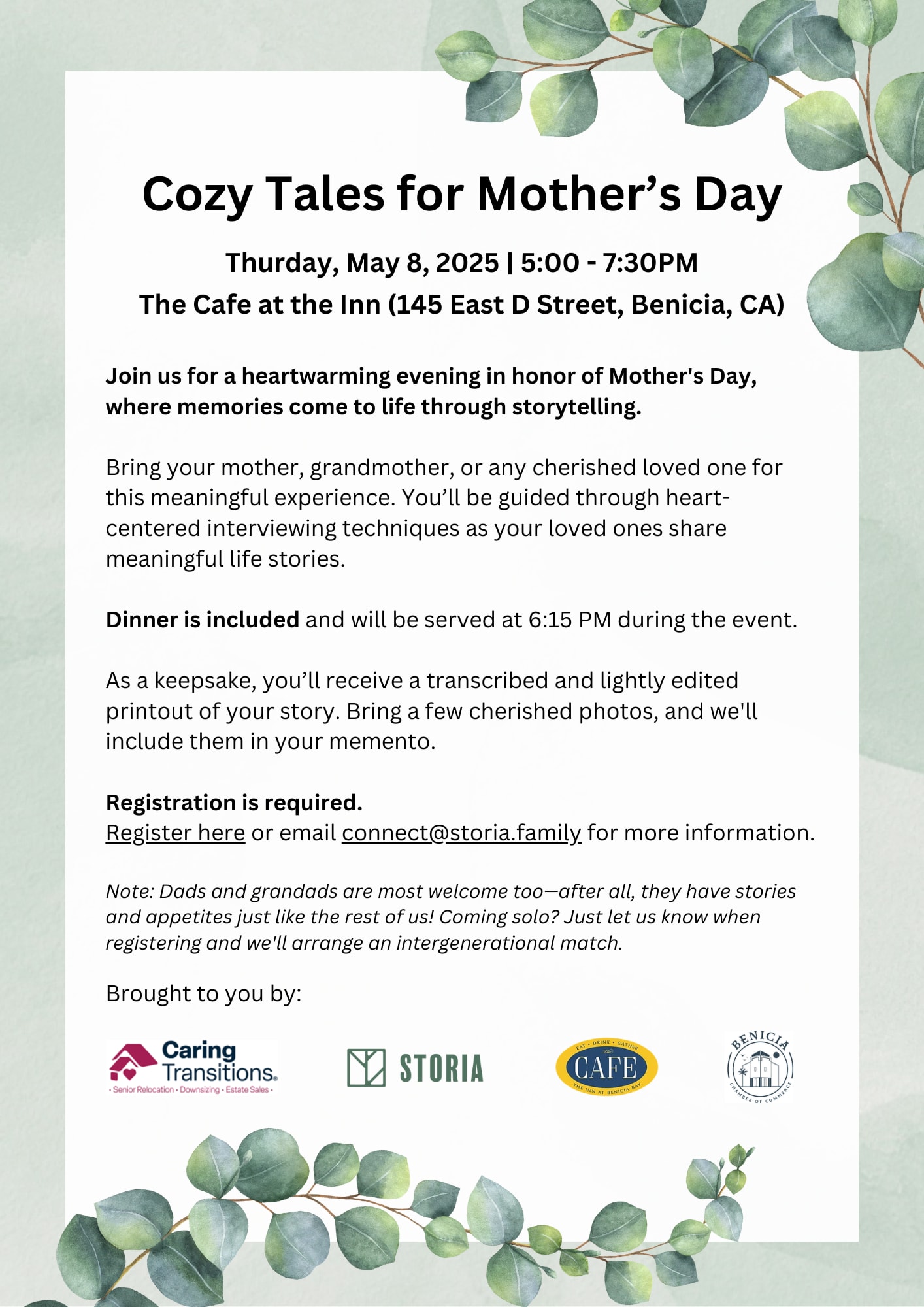 Thursday May 8th 5-7:30pm at The Cafe at the Inn. Bring your mother, grandmother, or any cherished loved one for this meaningful experience. You'll be guided through heart centered interviewing techniques as your loved ones share meaningful life stories Dinner is Included and you will receive a transcribed printout of your story.Images