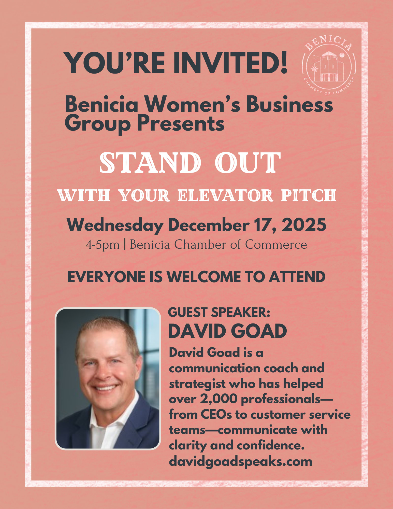 Wednesday December 17th join us for a free workshop with David Goad. He will be discussing how to stand out with your elevator pitch. 4-5pm at the Benicia Chamber of CommerceImages