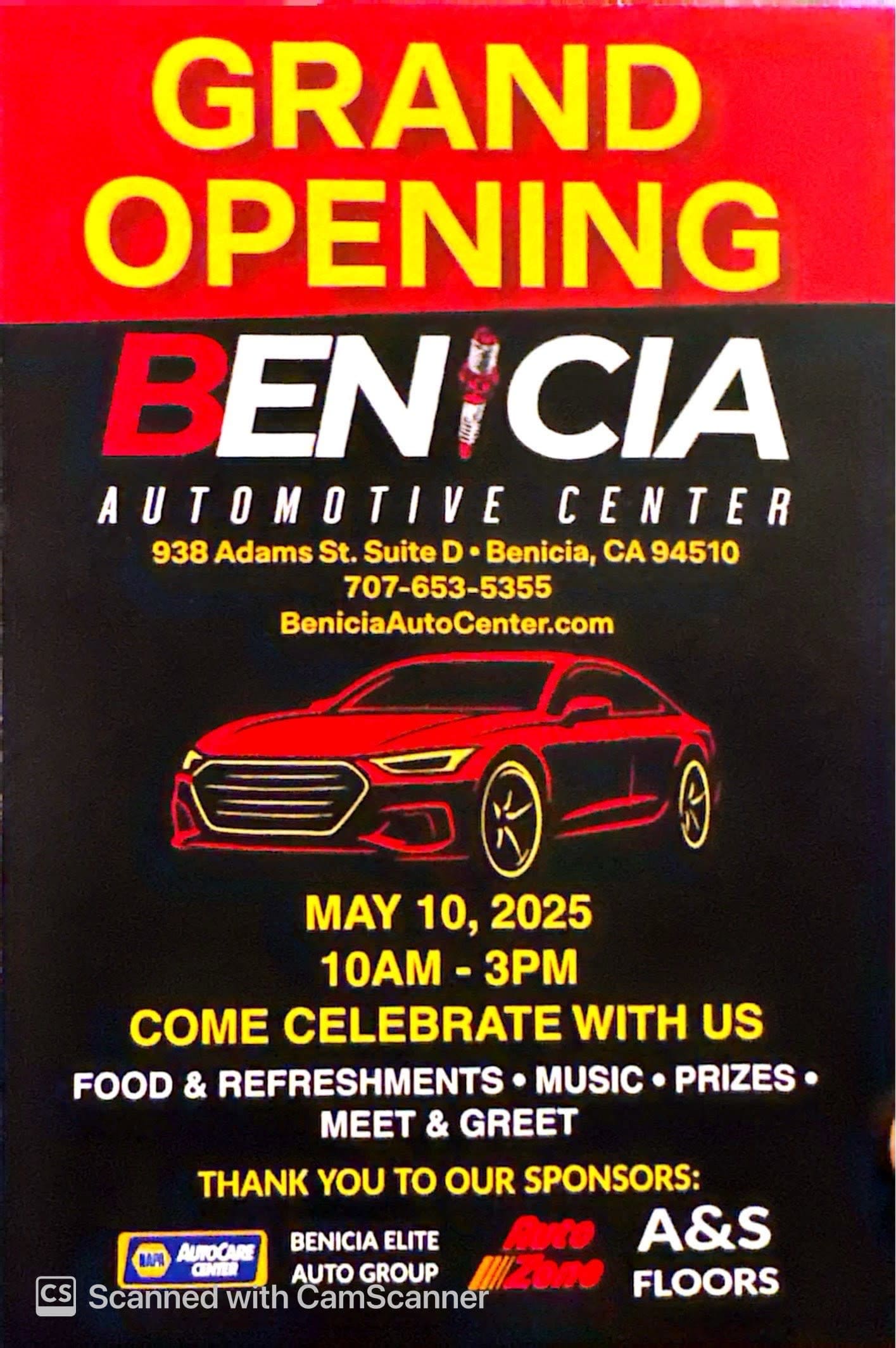 Come celebrate the Grand Opening of Benicia Automotive Center. May 10 10am-3pm 938 Adams St. Suite D in Benicia Enjoy Food & Refreshments, Music and prizes!Images