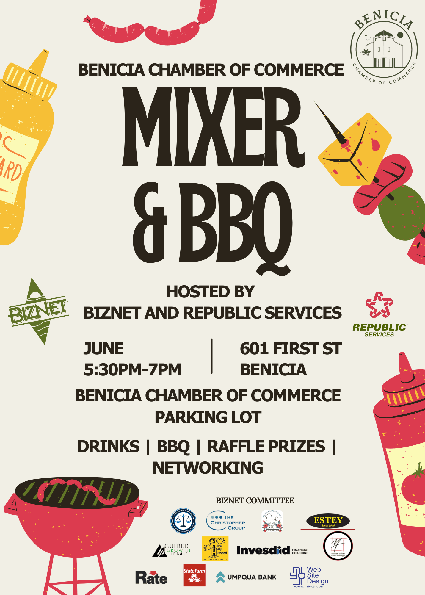 Join us on Wednesday, June 18th, 5:30-7pm for our monthly mixer. Our networking group BizNet will be hosting the mixer in the Benicia Chamber of Commerce parking lot. Enjoy lite bites, drawing and prizes, beer and wine for sale and networking. Don't forget your business cards!