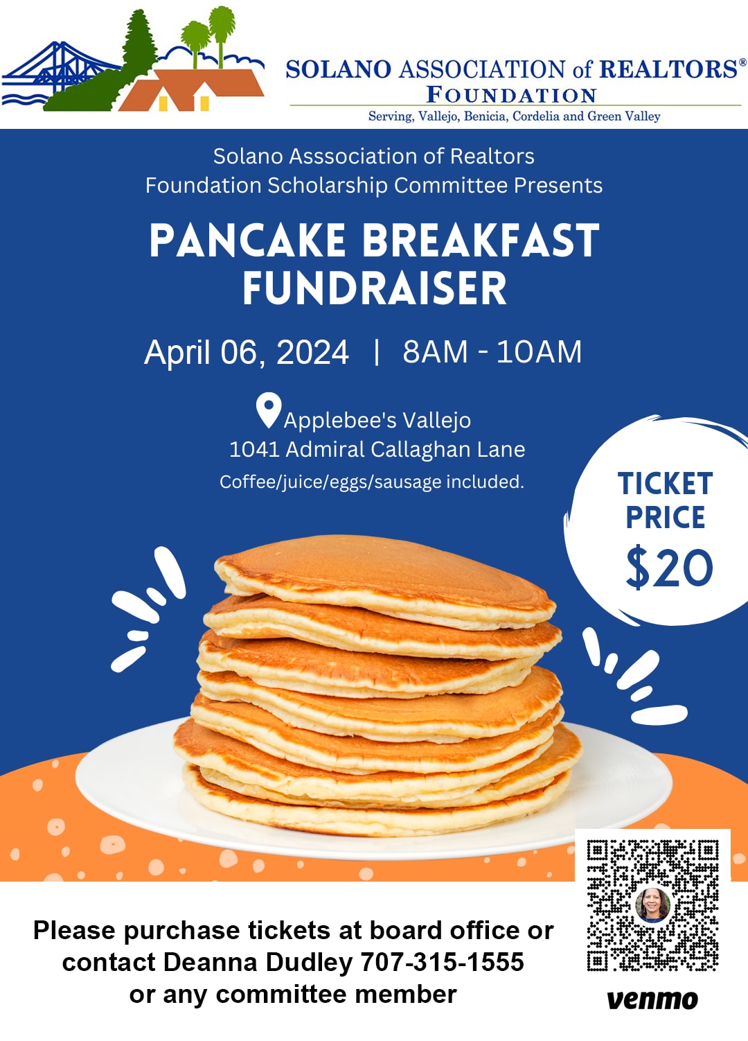 Solano Association of Realtors Foundation Scholarship Committee presents Pancake Breakfast Fundraiser on April 6th from 8am-10am at Applebee's in Vallejo. Tickets are $20Images
