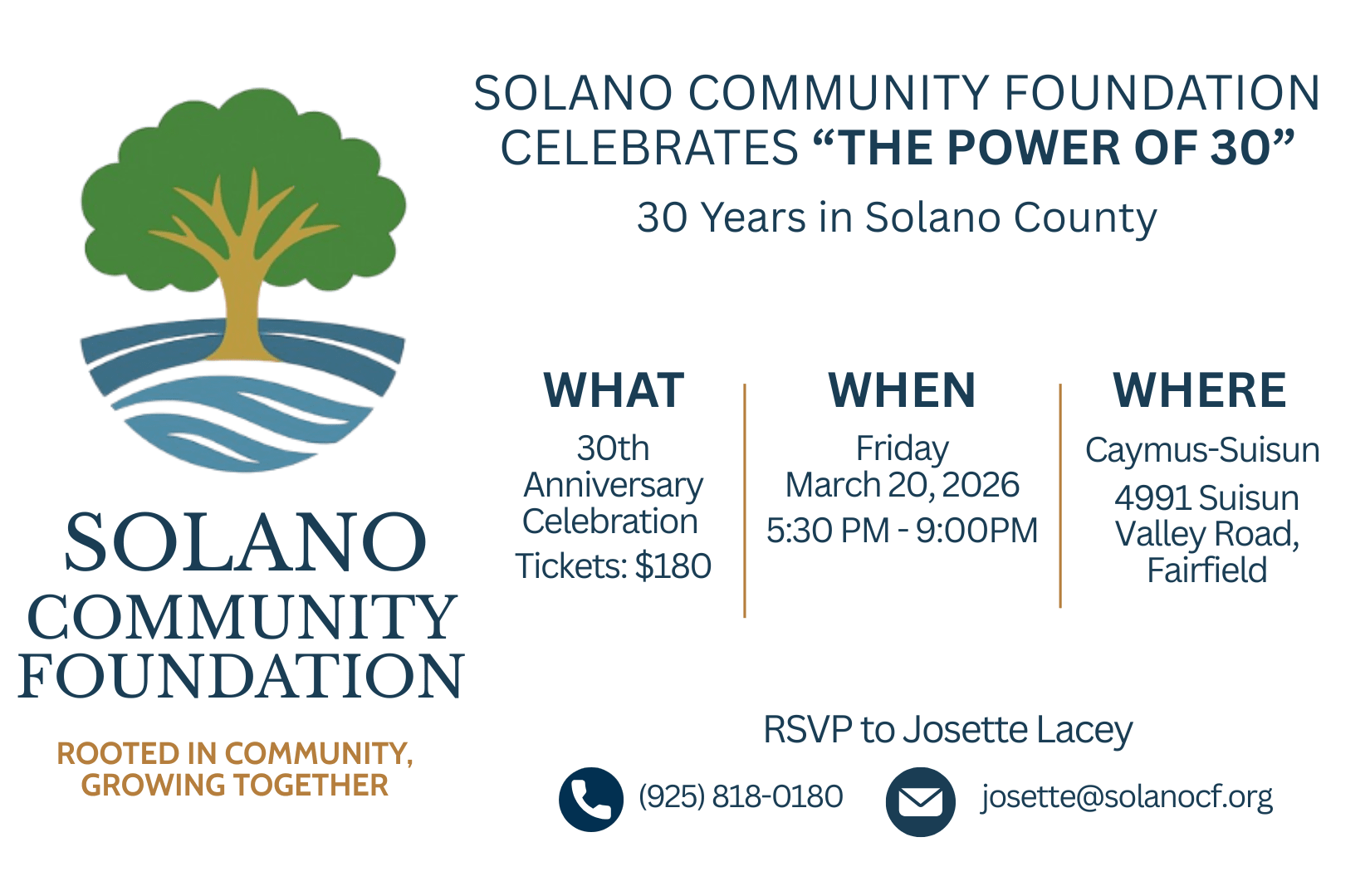 30th anniversary celebration of the Solano Community Foundation. March 20th 5:30pm-9pm at Caymus-Suisun 4991 Suisun Valley Road, Fairfield Tickets $180Images