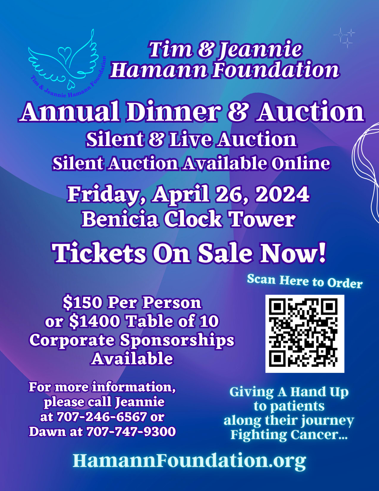 Tim & Jeannie Hamann Foundation will host their Annual Dinner & Auction on Friday April 26th at the Benicia Clock Tower. Tickets are on sale now! $150 per person or $1400 for a table of 10 Corporate Sponsorships Available Hamannfoundation.org Give a hand up to patients along their journey fighting cancer.Images